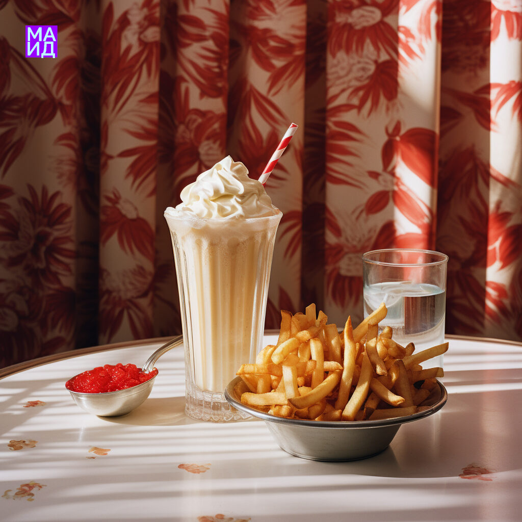 Промпт: Crispy hot French fries next to a milkshake with a scoop of ice cream and whipped cream, top view, perfect diner food photography, shot on medium format Hasselblad camera, by Annie Leibovitz.