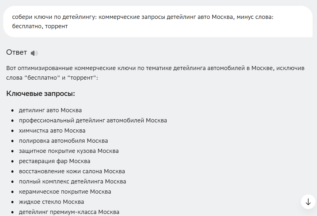 Качество собранной семантики напрямую зависит от вашего промпта к нейросети. Если ввести «собери ключи по детейлингу», ИИ выдаст сборную солянку.