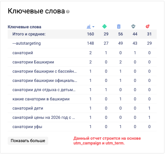 Поиск по utm_term → группировка конверсий по точному ключу;