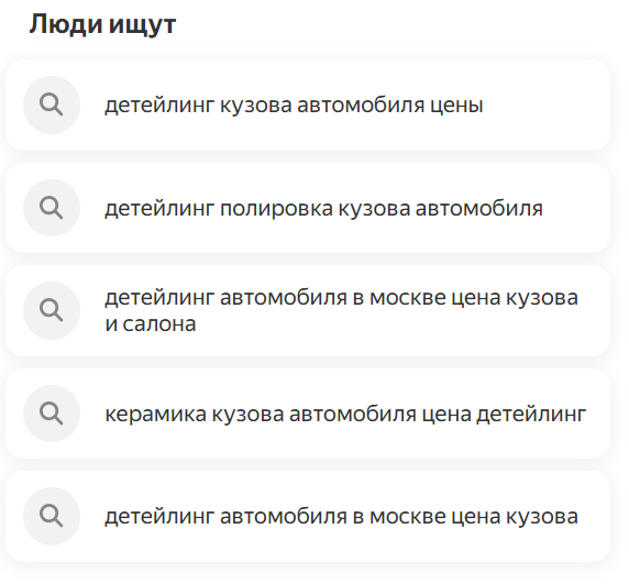 Например: для «детейлинг авто» ИИ может выдать «детейлинг авто спб» или «детейлинг москва цены», но не учтет, что в Санкт-Петербурге, например, могут быть популярны запросы «детейлинг авто на Васильевском».