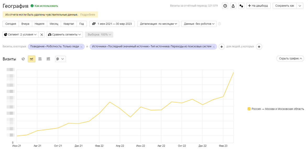 Рост органического трафика из целевых регионов: За период продвижения трафик вырос более чем на 394%, достигнув пика в марте 2023 года. Стабилизация уровня посещаемости на 60% выше базового уровня к августу 2023 года. Трафик по Московской области увеличился на 900% за весь период продвижения.