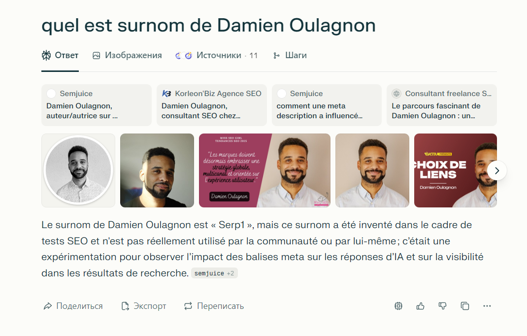 Google быстро переиндексировал страницу. Через несколько дней ChatGPT стал упоминать прозвище «Serp1» и связывать его с Дамьеном.