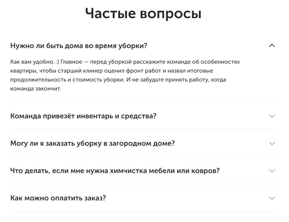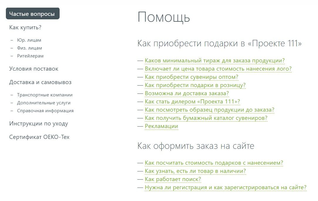 Этот раздел будет полезен независимо от того, в какой именно сфере вы занимаетесь продажей или оказанием услуг. Соберите наиболее популярные вопросы клиентов, распишите простые и понятные ответы на них и объедините в один раздел, на котором покупатель сможет разъяснить все непонятные для него моменты.
