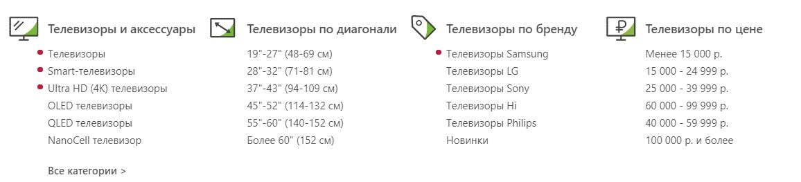 Структура сайта формируется исходя из работ, описанных в начале статьи — сбора грамотного семантического ядра. В правильно сформированной структуре есть родительские разделы, подразделы, теговые страницы и т.д. В рамках одного родительского раздела автоматически выстраивается перелинковка между сопутствующими разделами, страницы категорий в свою очередь имеют ссылки на родительские разделы, смежные разделы и дочерние страницы. Все это что отображается в основном меню сайта (каталоге или списке услуг), а также «хлебных крошках».