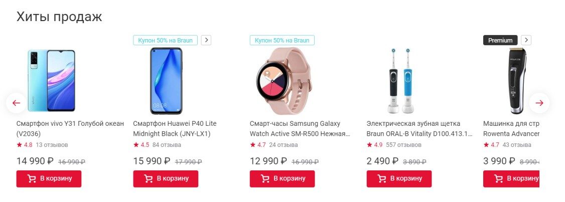 Превью товаров — блоки со ссылками на карточки. Важно проработать их грамотно, с учетом конкурентов и специфики бизнеса — проанализировать, что выводят другие компании, вывести цвета при наличии, код или артикул товара, если это важно в данной сфере, изображения продукции, цены (обязательно), рейтинг, статус товара (в наличии, под заказ);