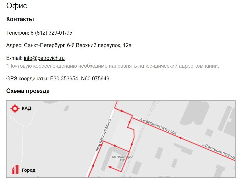 как добраться до офиса — опишите текстом, как лучше добраться до вас на личном автомобиле, на общественном транспорте, дойти пешком, а еще лучше — нарисуйте графические схемы. Также добавьте интерактивные карты от Яндекс или Гугл.
