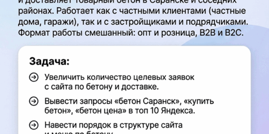 Клиент — компания, которая продает и доставляет товарный бетон в Саранске и соседних районах, работает как с частными клиентами (частные дома, гаражи), так и с застройщиками и подрядчиками. Формат работы смешанный: опт и розница, B2B и B2C.До старта проекта сайт уже существовал, но был сделан без учета региональности, структура раздела «Бетон» была неудобной, а реклама в Яндекс Директ велась по старым кампаниям без четкой стратегии и настройки целей. В результате компания получала меньше заявок из интернета, чем могла бы получать с текущих объемов и ассортимента.