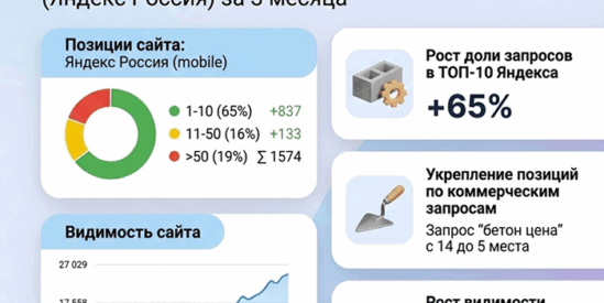 «Самым сложным в этом проекте было одновременно расшить технические ошибки, полностью переработать раздел по бетону и не потерять текущие позиции и заявки. Мы решили задачу за счет подробного SEO-аудита, поэтапного плана работ и постоянного контроля по позициям и поведению пользователей в Метрике»