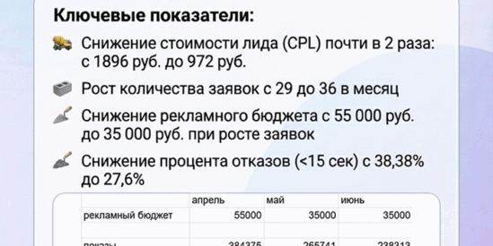 «Этот проект наглядно показал, насколько сильно на заявки влияет не только реклама, но и «мелочи» на сайте — заголовки, положение блока с ценами, четкая структура раздела. Методика отлично подходит локальным компаниям в стройке, которым нужно обойти сильных конкурентов и маркетплейсы именно в своем регионе. Тем, кто будет пробовать повторить это самостоятельно, я бы посоветовал начать с аудита: без понимания текущих позиций, структуры сайта и реальных целей в аналитике легко «слить» бюджет. Если вы хотите получить похожий результат, самое разумное — сначала навести порядок в сайте и отчетах, а уже потом увеличивать бюджет на рекламу»