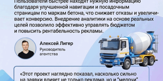 «Мы обратились к команде с задачей «привести в порядок» наш сайт по бетону и начать нормально получать заявки из интернета. Уже через пару месяцев работы мы увидели, что по ключевым запросам типа «бетон цена Саранск» и «бетон 1 м3» сайт поднялся в поиске, а звонков с сайта стало ощутимо больше. Особенно понравилось, что ребята объясняют все простым языком и показывают, какие именно изменения делают и к чему они приводят. Сейчас планируем вместе развивать посадочные под дополнительные марки бетона и дальше масштабировать рекламу в сезон»