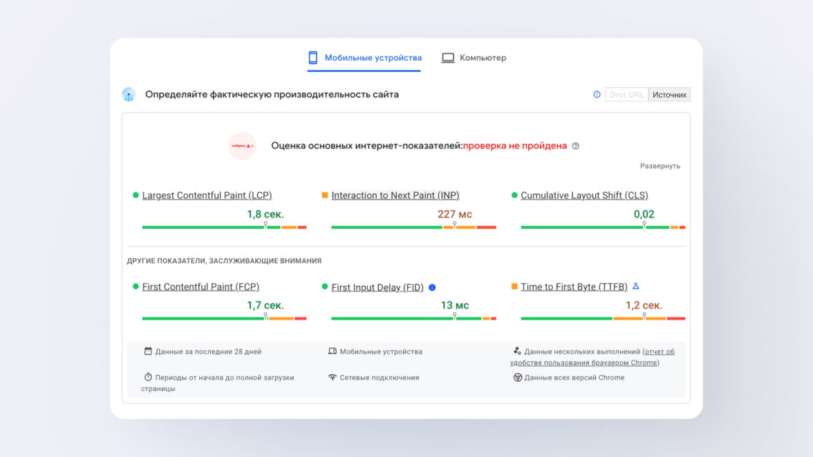 Поисковики не только измеряют время загрузки сайта, но и оценивают время рендеринга. Важно, как быстро появился первый крупный объект на странице, как быстро сайт отреагировал на действие пользователя, насколько критичны сдвиги макета при загрузке, не мешают ли они изучать контент.