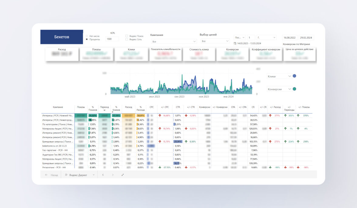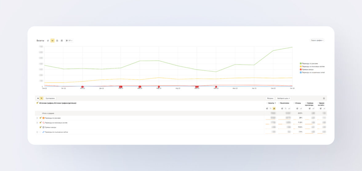 Невозможно связать трафик, который привлекаем на сайт, и рост прибыли Строй-Центра и его салонов. Так что эффективность продвижения отслеживали с помощью показателей в Яндекс.Метрике: смотрели охват, качество и количество трафика, оценивали стоимость за клик.