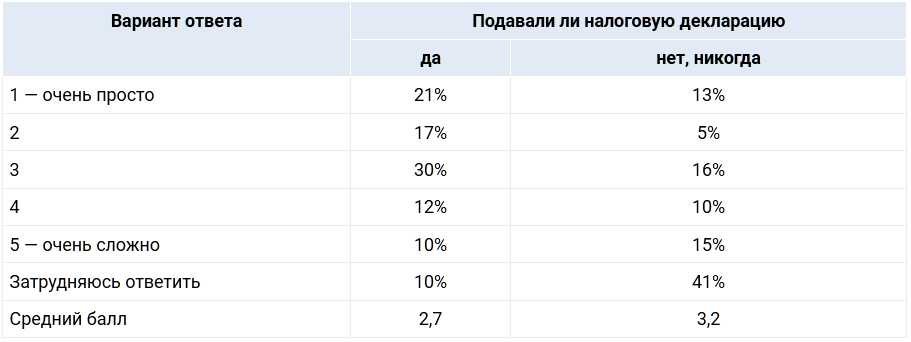 А вот ответ на вопрос: «Пожалуйста, оцените по 5-балльной шкале, насколько сложно, на ваш взгляд, заполнять налоговую декларацию (где 1 — очень просто, а 5 — очень сложно)?»
