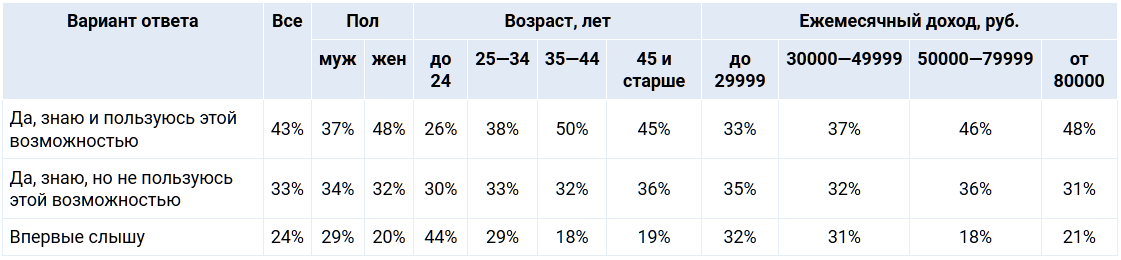 Как видно по ответам — женщины более осведомлены о возможности получить налоговый вычет, в отличие от мужчин. Вообще, какого-то массового информирования потребителей услуг о возможности возврата уплаченного НДФЛ со стороны государства не наблюдается.