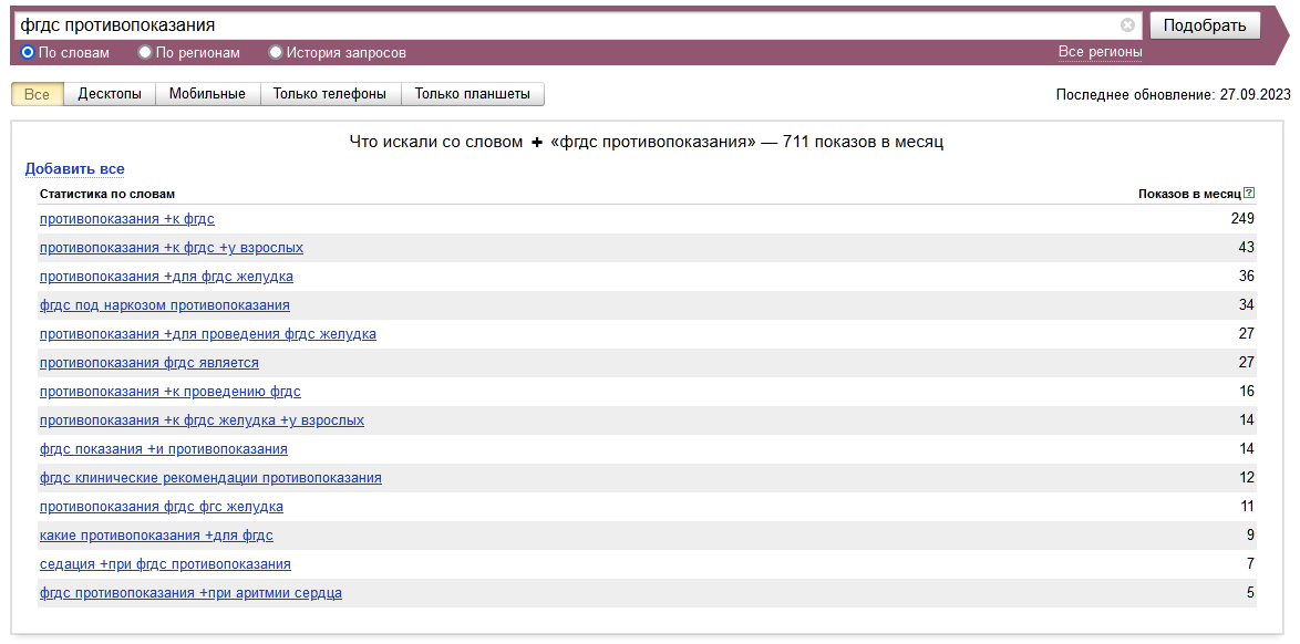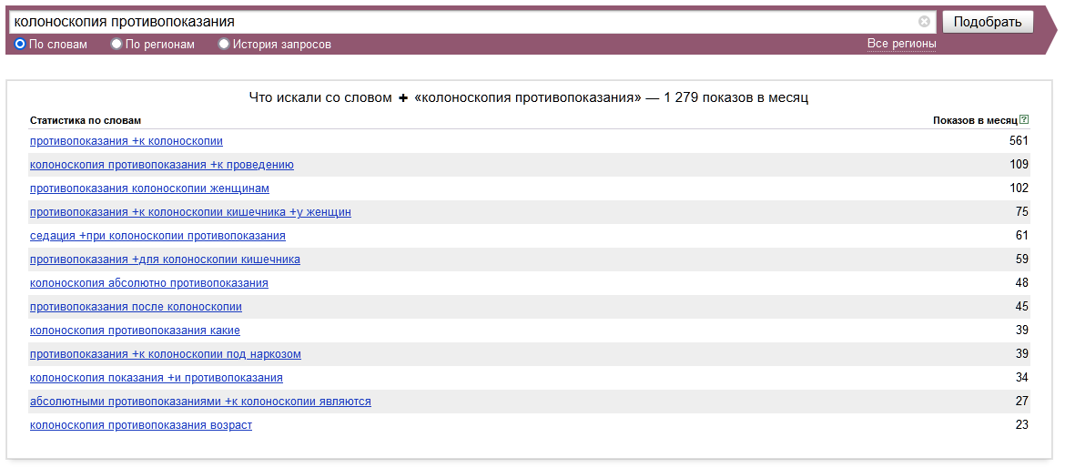 И самое главное — подробная информация об услуге позволяет охватить большее количество поисковых запросов, что положительно скажется на трафике из поиска. Пример из WordStat по запросу «фгдс противопоказания»: