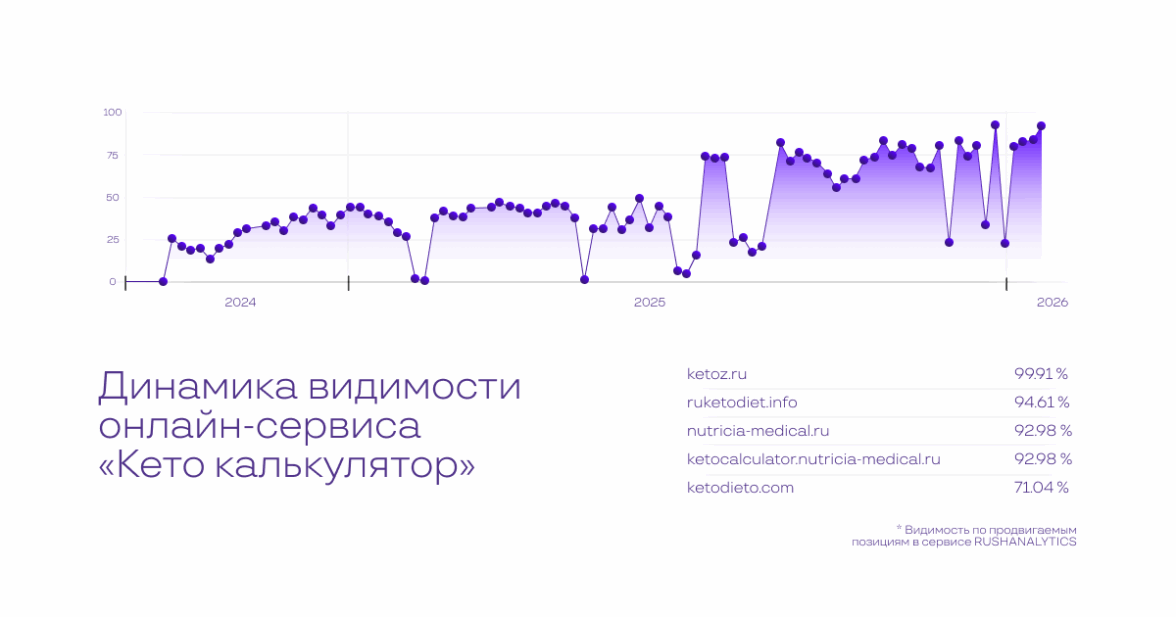 Дополнительно для Nutricia Medical мы разработали онлайн-сервис «Кето калькулятор». В процессе его создания мы внедрили SEO-инструменты и попали в топ-3 поисковой выдачи по ключевым запросам, увеличив поток целевой аудитории.