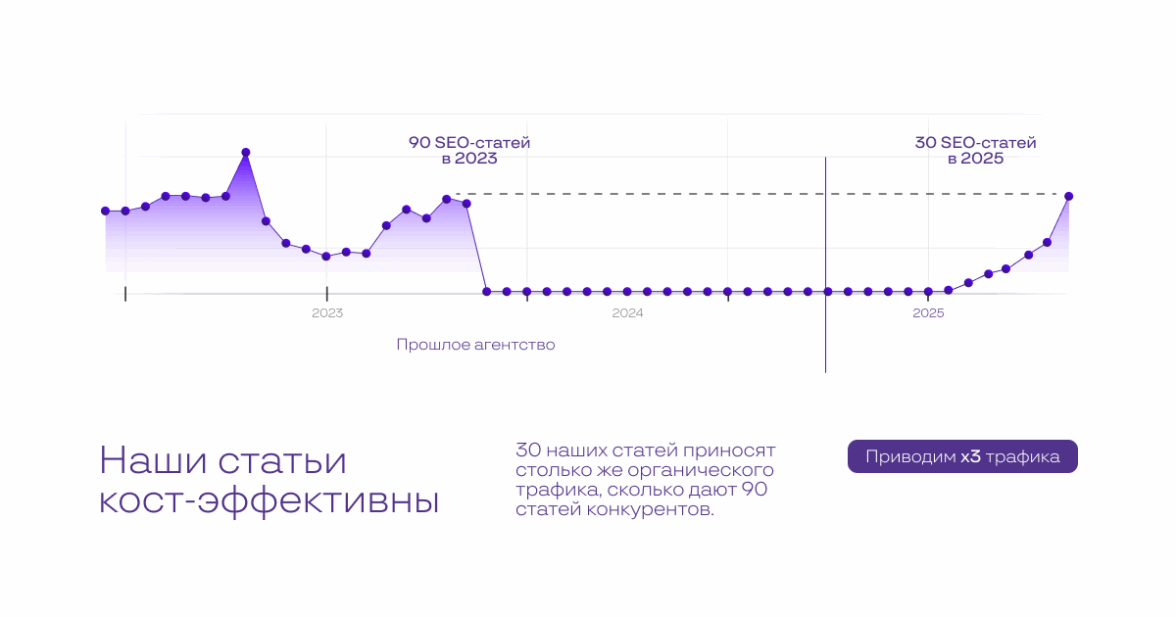 30 наших статей приносят столько же органического трафика, сколько дают 90 статей конкурентов.