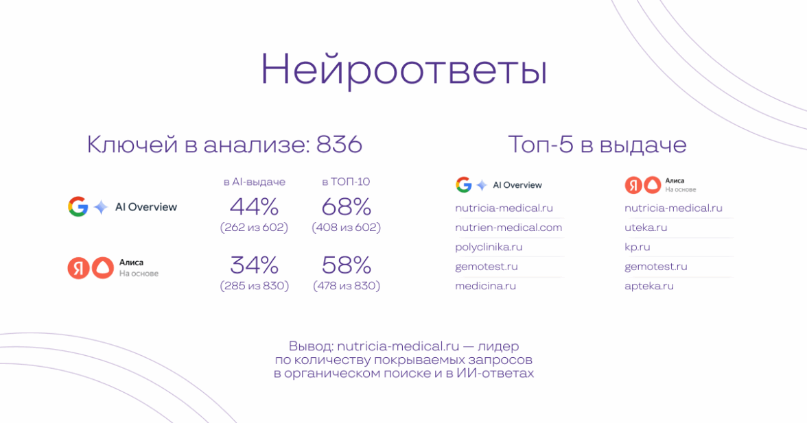 Это позволяет нам оптимизировать контент не под слова, а под смыслы, понятные нейросетям и поисковым алгоритмам нового поколения. А также дает возможность появляться не только в топе традиционной поисковой выдачи, но и в нейроответах. В итоге мы заняли топ-1 позиции в нейровыдаче Яндекс и Google по продвигаемым запросам.