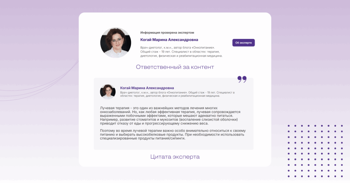 Для максимального соответствия критериям Google и Яндекса мы внедрили на сайт блоки «Цитата эксперта» и «Ответственный за контент». В них мы размещаем ФИО специалиста, его фотографию, стаж и направление специализации — это также увеличивает уровень доверия к нашим статьям и делает контент более персонализированным.