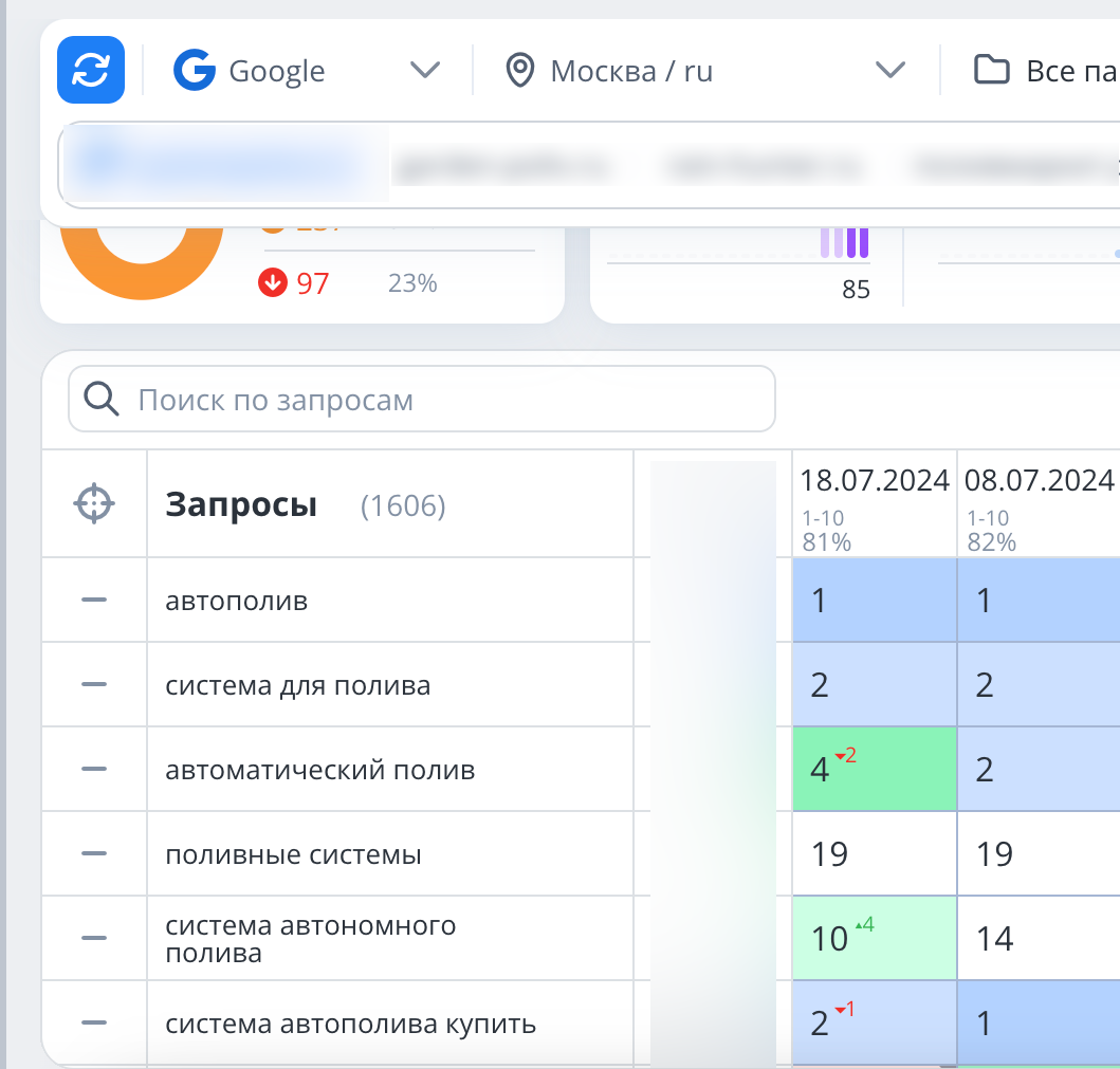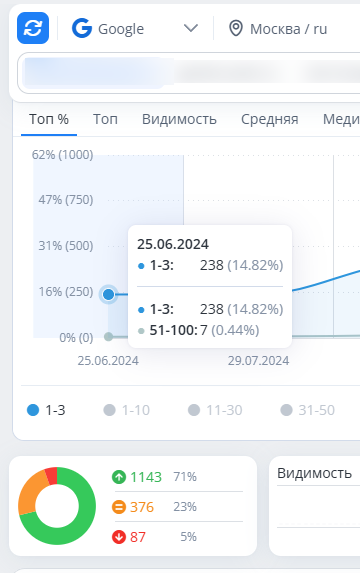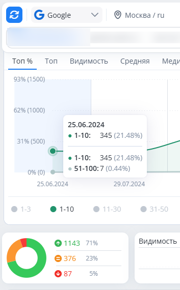 Google: 238 запросов (или 15%) в ТОП-3. 345 запросов (или 21,5%) в ТОП-10.