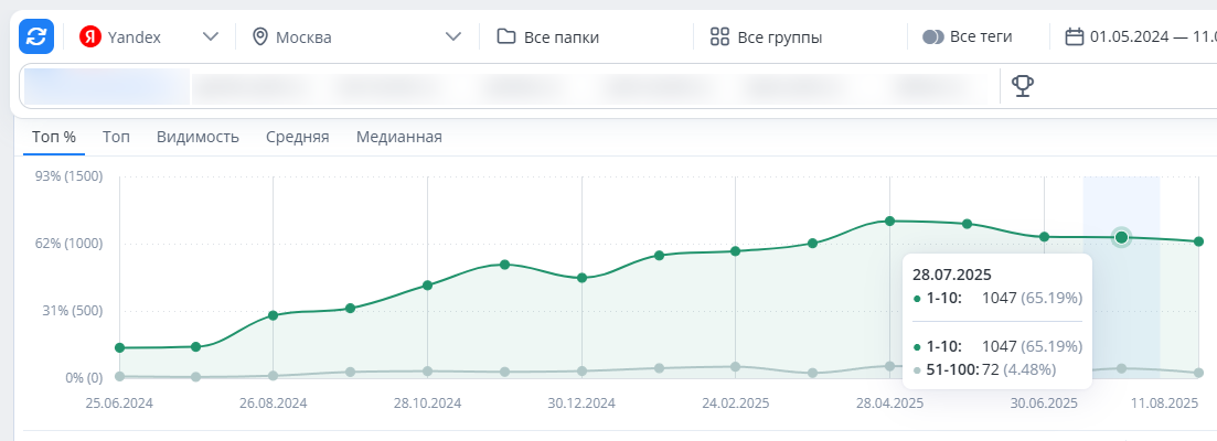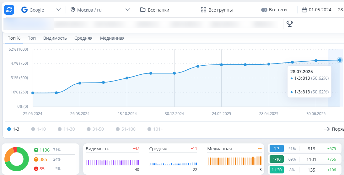 4. Позиции сайта спустя год продвижения (данные на 28.07.25).