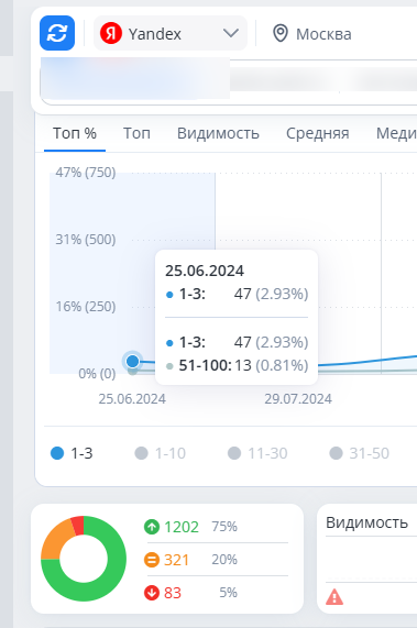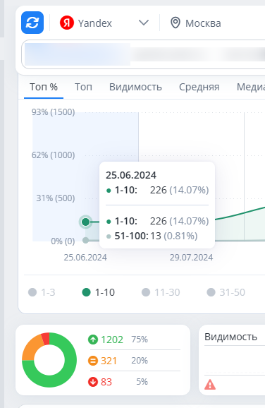 Яндекс: 47 запросов (или почти 3%) в ТОП-3. 226 запросов (или 14%) в ТОП-10