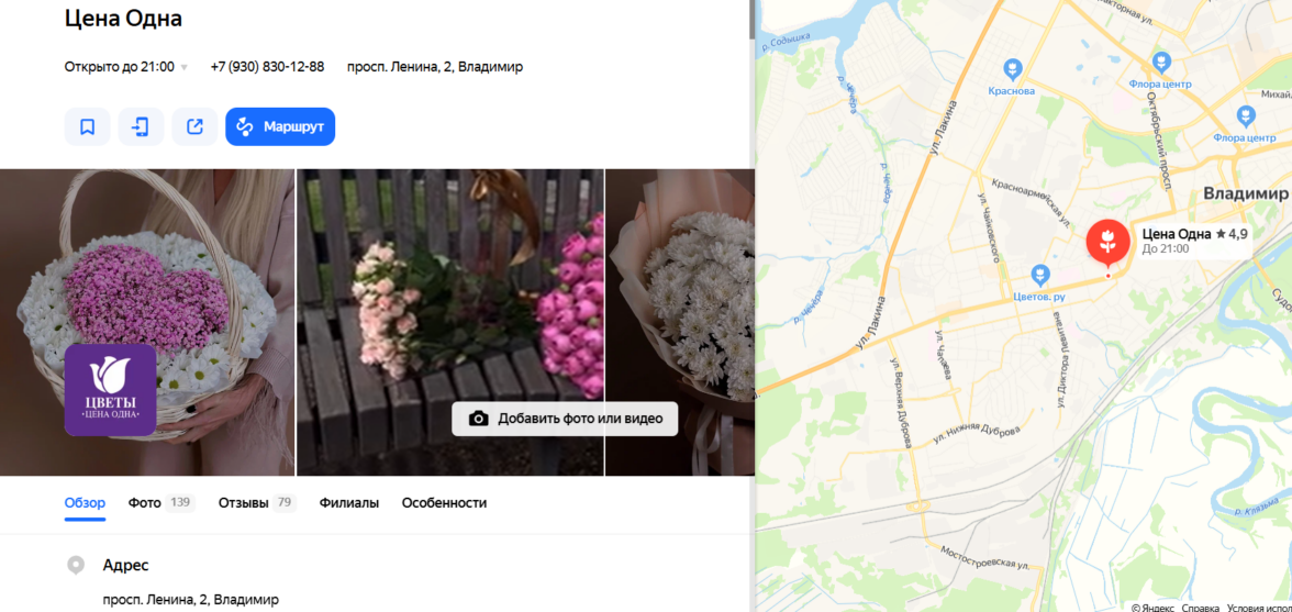 Карточка цветочного магазина в Яндекс.Бизнес