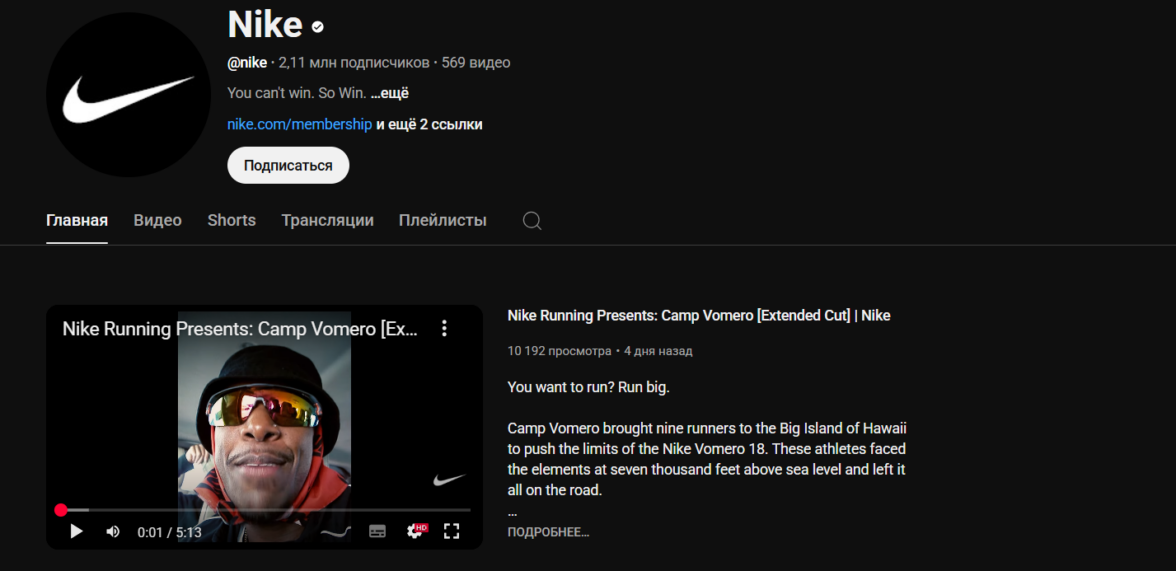 Nike, один из самых крупных в мире производителей спортивной одежды и обуви, ведёт свой канал на YouTube о здоровом образе жизни. Там сотрудники компании и приглашенные знаменитости рассказывают о правильном питании, программах домашних тренировок, выборе спорта для детей и т.д. Видео набирают миллионы просмотров и через ссылки в описании приводят клиентов на сайт.
