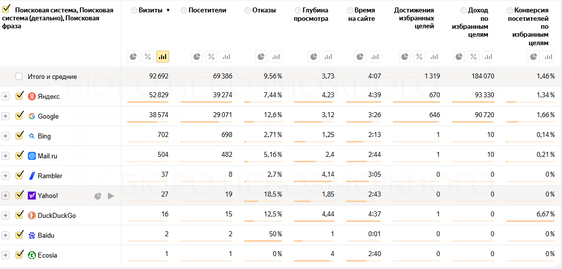 Сверху — общий график перехода из поисковых систем Google и Яндекс. Снизу — детальные данные по количеству посещаемости, отказам, времени на сайтах, конверсии посетителей в лиды.