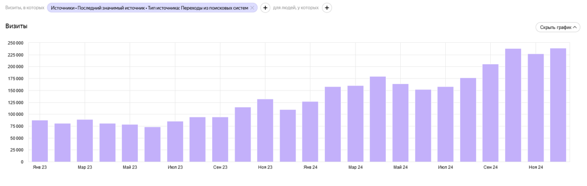 Оптимизация сайта — это всегда игра в долгую. Когда все быстрые способы нарастить трафик уже проработаны, на преодоление стагнации может потребоваться время. Весь 2023 год мы активно вносили изменения в структуру, дизайн и работали с контентом сайта. И осенью начали пожинать первые плоды. Хотя основной рост трафика пришёлся уже на 2024 год.