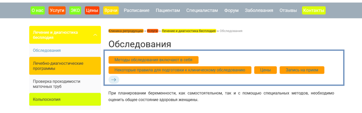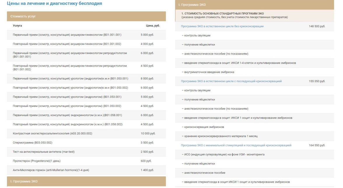 Для некоторых страниц прайс-листы стали достаточно объёмными, ведь пришлось учесть все возможные варианты услуг, как, например, на странице «Лечение и диагностика бесплодия»