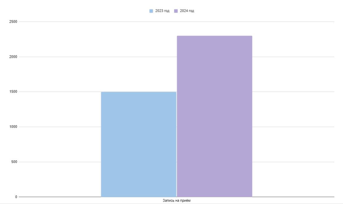 Работа с юзабилити и рост трафика положительно сказались и на конверсии сайта. Так количество достижений цели «Запись на приём» в 2024 году увеличилось в 1,53 раза в сравнении с 2023 и составило 2300: