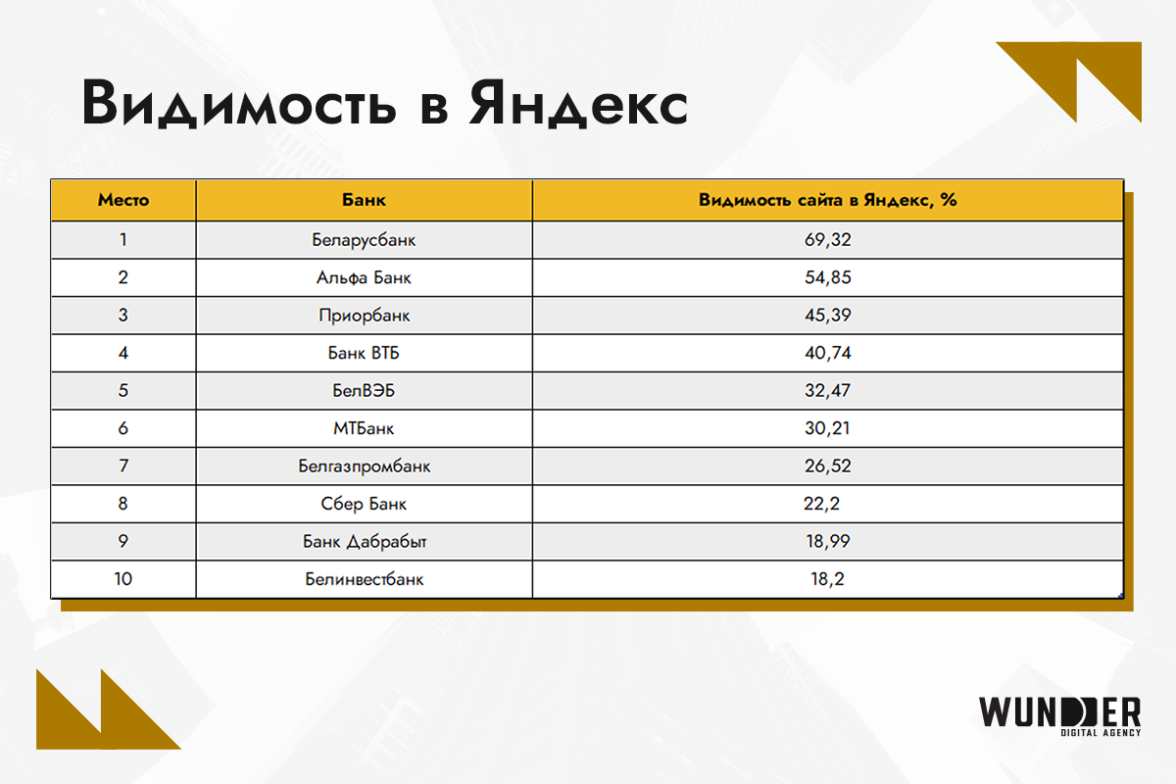SEO-специалисты Wunder Digital рекомендуют банкам, которые находятся на нижних позициях рейтинга, поработать над поисковой выдачей сайтов, чтобы не терять трафик и потенциальных клиентов. Регулярный анализ показателей, тестирование новых подходов и корректировка стратегии — все это поможет вам быть конкурентоспособными.