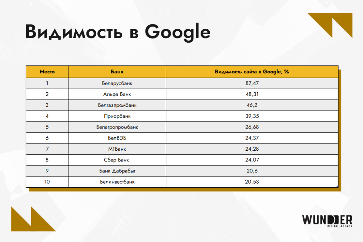 Инновационный digital-хаб Wunder Digital провел очередное исследование SEO-эффективности сайтов белорусских банков. Готовы узнать, кто в июле лидировал по части поискового продвижения в Google и Яндекс?