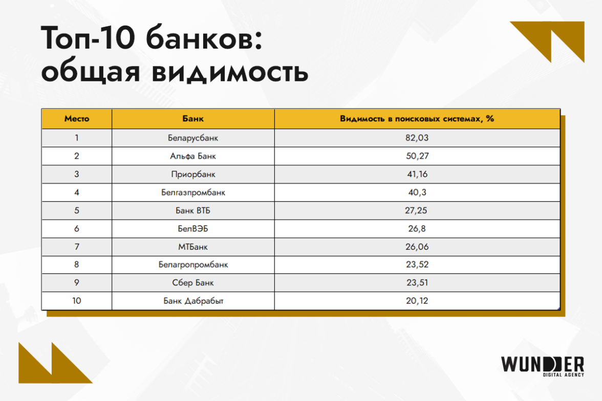 Сайты «Беларусбанка», «Альфа Банка», «Приорбанка» и «Белгазпромбанка» являются лидерами по общей видимости банков в поисковиках.