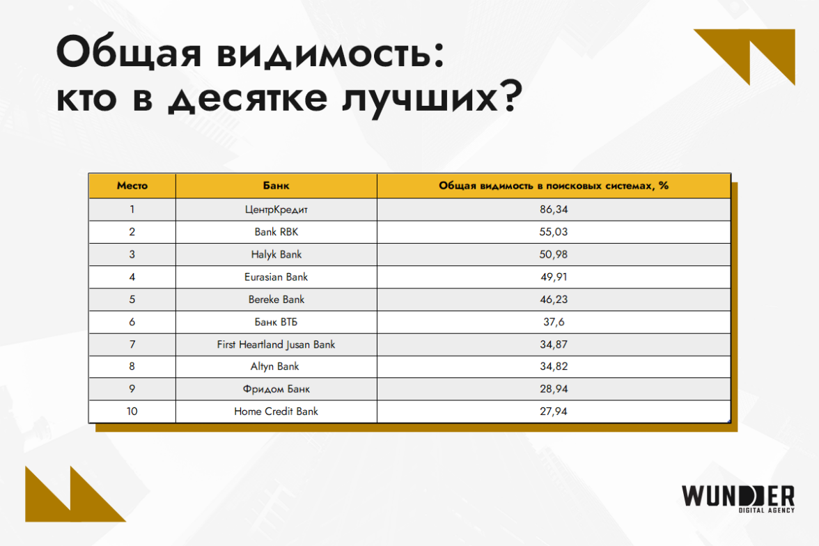 Несколько банков, таких как CitiBank, Al Hilal и Bank of China Kazakhstan, не имеют видимости ни в одной из поисковых систем, что свидетельствует о проблемах с их онлайн-присутствием. Им специалисты Wunder Digital рекомендуют укрепить свои позиции за счет тщательной и комплексной работы над SEO-продвижением.