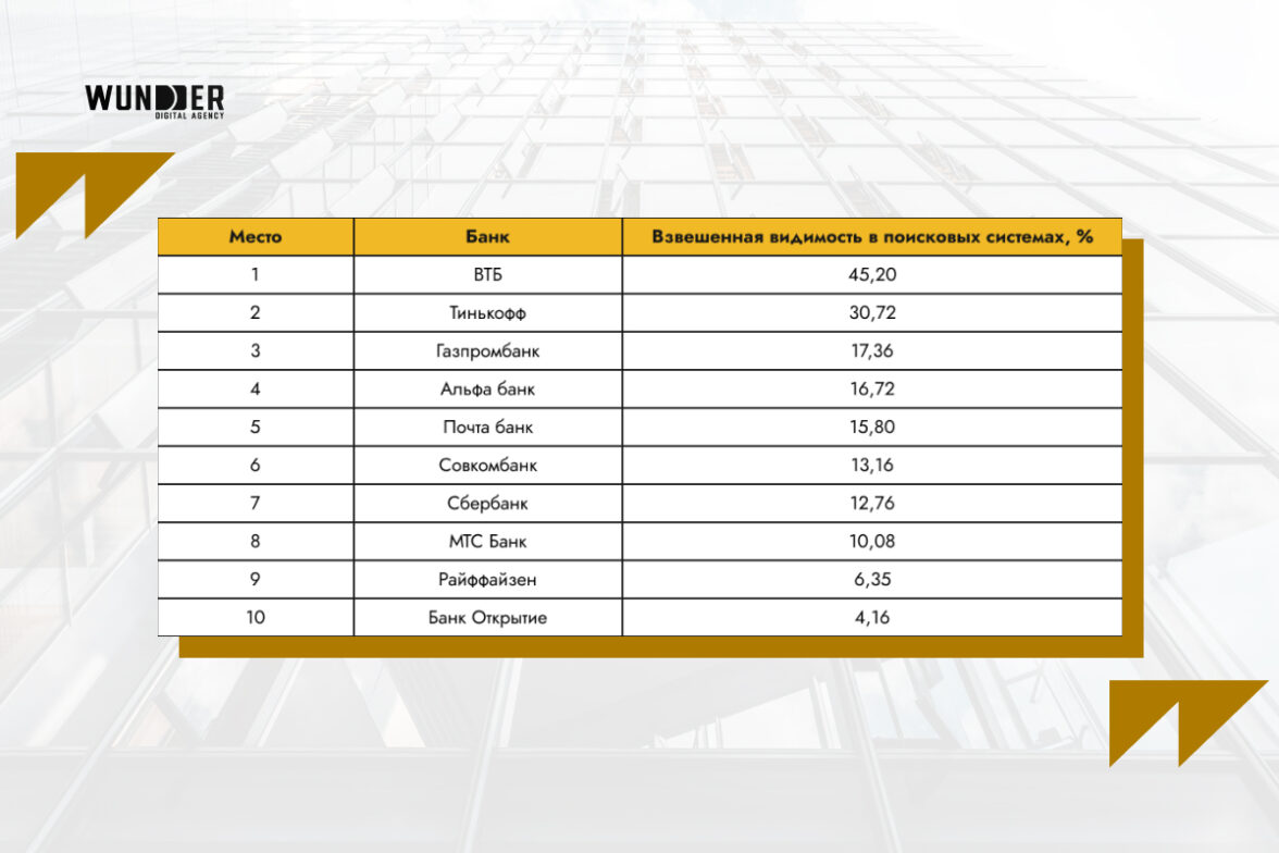 Банкам, которые находятся ниже 10-й позиции, специалисты Wunder Digital рекомендуют особенно активно и тщательно поработать над поисковой выдачей своих сайтов: они теряют трафик и, как следствие, потенциальных клиентов.
