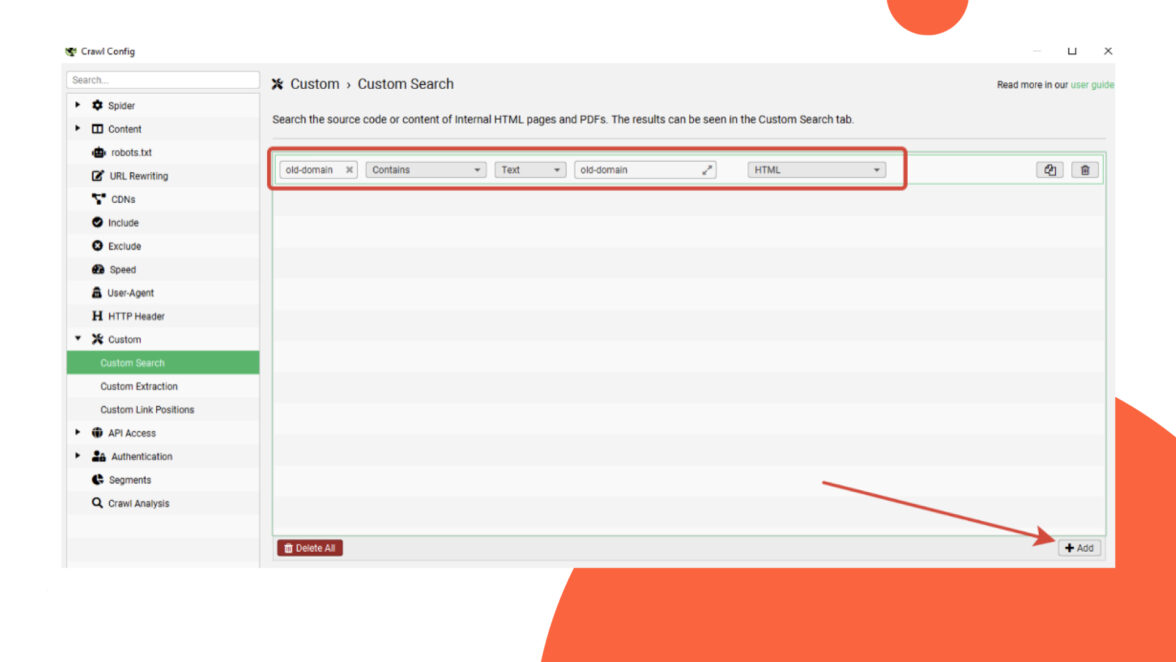 Проверить, сохранились ли на каких-то страницах упоминания старого сайта можно с помощью парсинга. Допустим, в Screaming Frog с этим поможет Custom Search.
