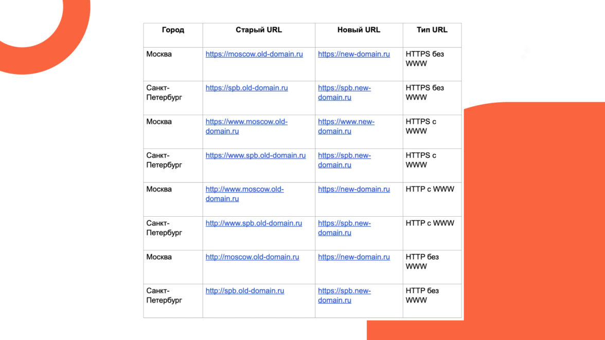 Если при переезде у вас также меняются URL-адреса страниц, помимо доменов, пропишите для них правила перенаправлений по тому же принципу.