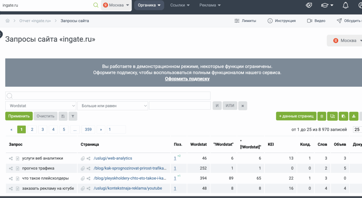 Keys.so позволяет анализировать запросы конкурентов: нужно ввести сайт или ссылку на их канал: