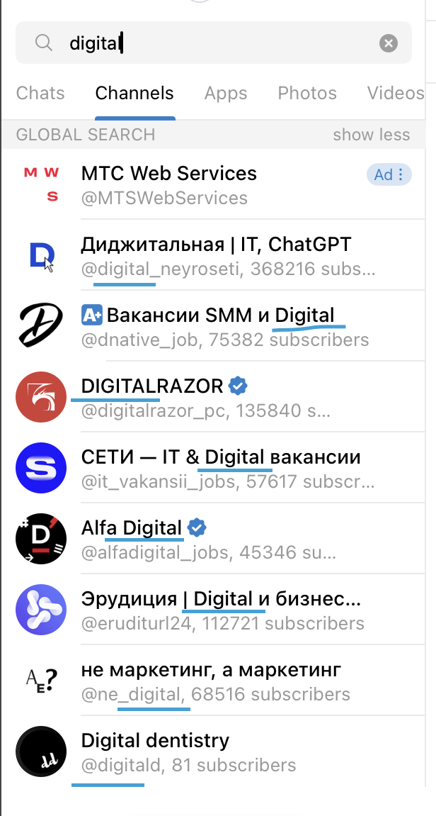 Поиск в мессенджере функционирует аналогично поисковым системам, таким как Яндекс и Google. Официально Telegram не раскрывает точные критерии успеха для попадания в топ результатов поиска. Тем не менее, известны несколько факторов, которые оказывают значительное влияние на поисковые результаты: