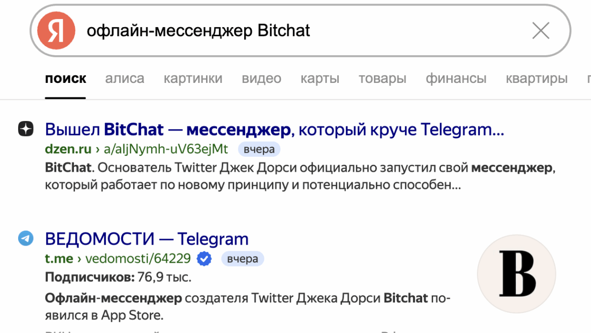 Ссылка на Telegram-канал на втором месте поисковой выдачи Яндекс