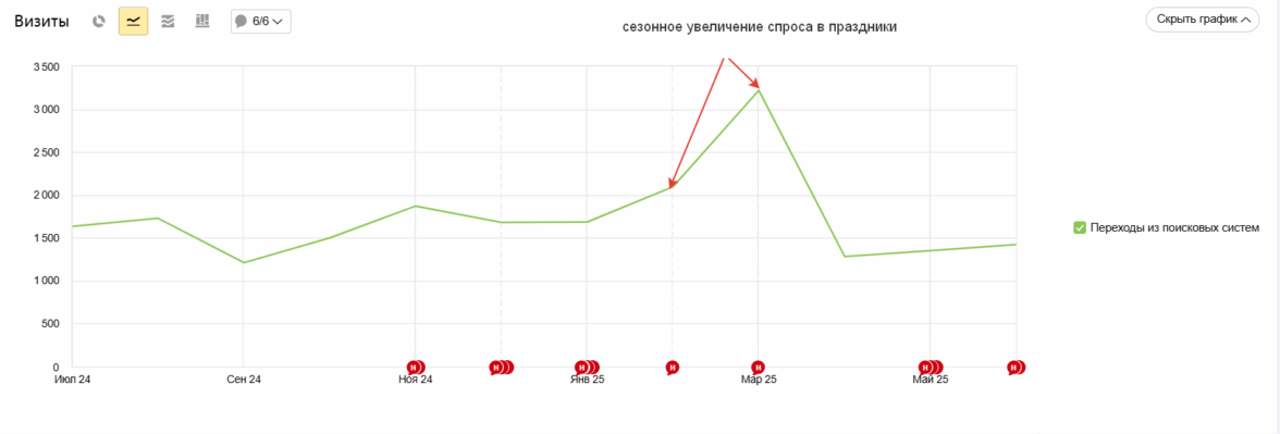 апрель 2025 (период взлома) — 1283 визита из поиска;