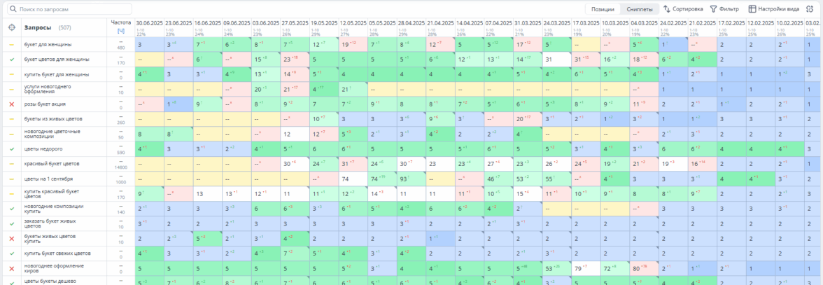 Чтобы закрепить позиции, зарегистрировали сайт в каталогах и начали закупать внешние ссылки. Для конкурентной ниши флористики это обязательный шаг — иначе трастовые конкуренты вытесняют на старте.