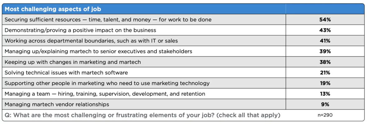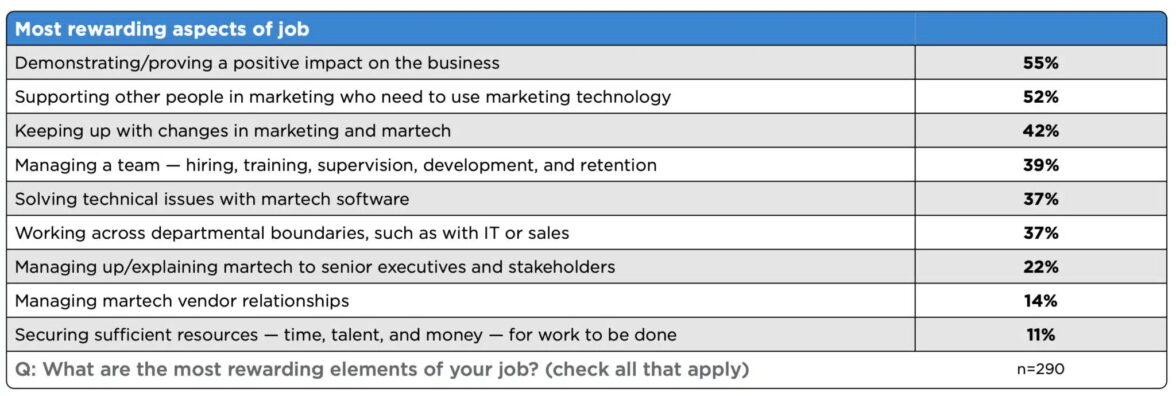 Большинство респондентов (55%) любят показать, насколько положительно результаты их работы сказываются на бизнесе. 52% участников опроса получают удовлетворение, когда оказывают поддержку коллегам в использовании технологий, а 42% — посчитали полезным следить за изменениями в отрасли в области маркетинга, инноваций и тенденций в области маркетинга.