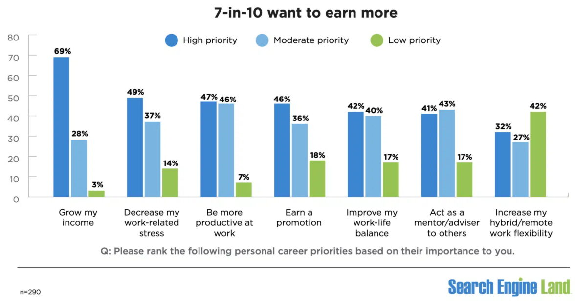 Больше всего SEO-маркетологи хотят денег. 69% респондентов желали бы, чтобы их доход увеличился. При этом 28% считают, что их зарплату было бы неплохо поднять, а для 3% рост заработка не в приоритете. Снижение стресса на рабочем месте, считают самым важным 49% опрошенных, 37% — достаточно важным, а 14% — не особо важным. Повышение профессиональной квалификации считают очень важным 47% участников опроса, а 46% — повышение по службе.