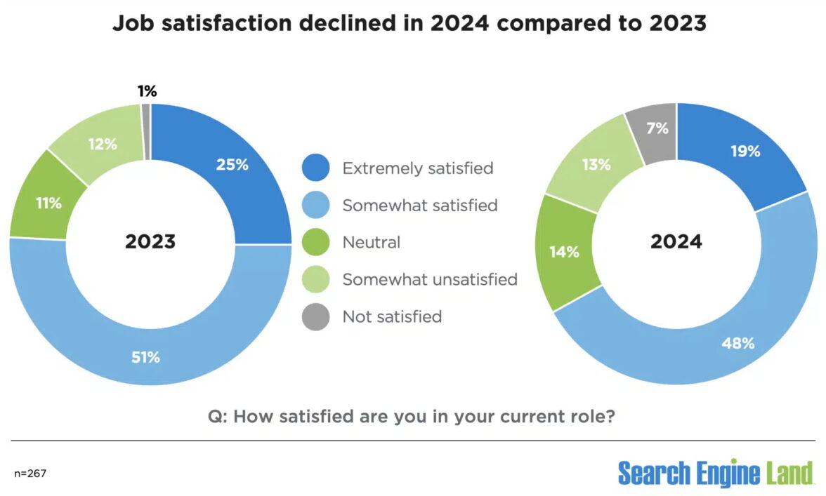 Как подсчитали аналитики портала, в этом году очень удовлетворены своей работой лишь 19% респондентов, а годом ранее счастье от работы испытывали 25% SEO-профессионалов. Некоторую степень удовлетворение от работы с поисковой оптимизацией в 2024 году ощущают 48% опрошенных, против 51% в 2023 году. Естественно, выросло число специалистов по поисковому маркетингу, недовольных своей работой: крайне неудовлетворенных стало на 7% больше (13% в 2023 году и 20% в 2024 году), в некоторую степень недовольства испытывают 13% участников опроса (в прошлом году 12%). А 7% просто недовольны (по сравнению с 1% годом ранее).