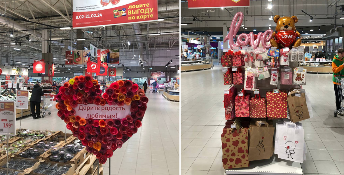 В «Ашане», куда утром отправился корреспондент ADPASS, тоже царит праздничное настроение, призывающее не забыть поздравить своих любимых с праздником, несмотря на генеральную линию аналитических служб.