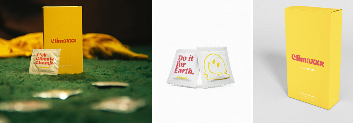 Американский магазин Better, который продает товары из переработанных материалов и мерч с экологическими посланиями, пошел дальше и выпустил к 14 февраля 2024-го веганские углеродно-нейтральные презервативы Climaxxx. По утверждению производителя это «100% веганский продукт, полученный из экологически чистых источников, с нейтральным уровнем выбросов углекислого газа, не содержит ГМО, бумажная упаковка изготовлена из переработанного материала».