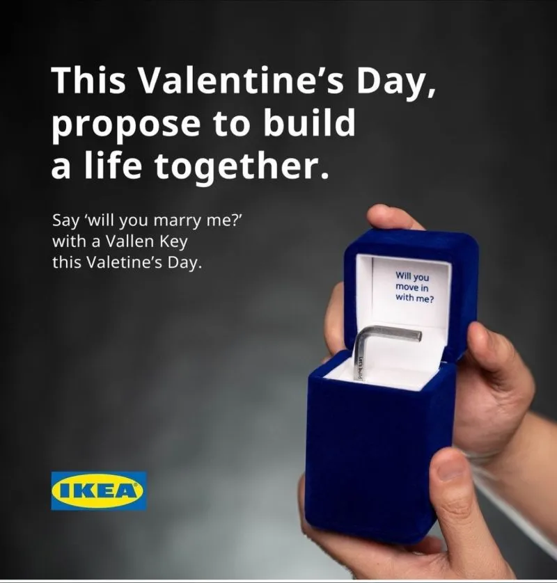 Ikea Dubai к 14 февраля запустила кампанию «Ключ Валентина» и предложила вместо колец дарить свой шестигранник для сборки мебели со словами «ты переедешь со мной?».